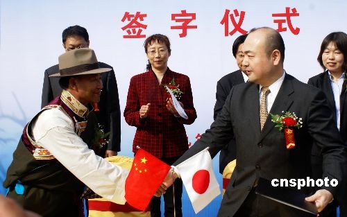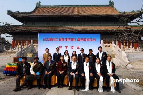 三月十七日,日本援助西藏扎囊县医院立民项目签字仪式,在西藏自治区人民政府驻北京办事处举行。西藏自治区人民政府驻北京办事处副主任赵国庆女士(右五)与日本驻华大使馆公使片山和之先生(右四)出席了签字仪式。此项目向扎囊县医院援助六十万人民币,扎囊县常驻人口有三点六万人。中新社发 马伟东 摄