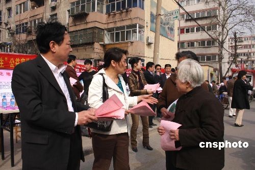 三月十九日上午,河南省强制隔离戒毒所所长陈新民(左)向社区居民发放禁毒公开信。当日,陈新民率领干警深入社区门口,给居民讲解毒品危害,劝居民远离毒品。中新社发 王中举 摄