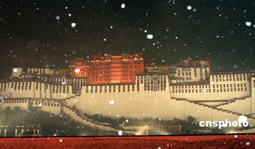 3月19日晚,拉萨市下起瑞雪,夜幕下,银装素裹的布达拉宫分外美丽。中新社发 杜洋 摄