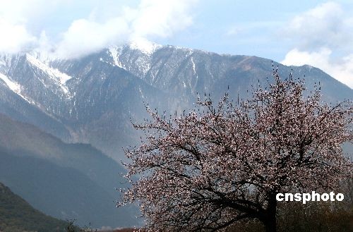3月23日,西藏川藏公路旁成片的桃花盛开,在雪山的映衬下分外美丽。中新社发 杜洋 摄