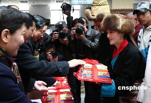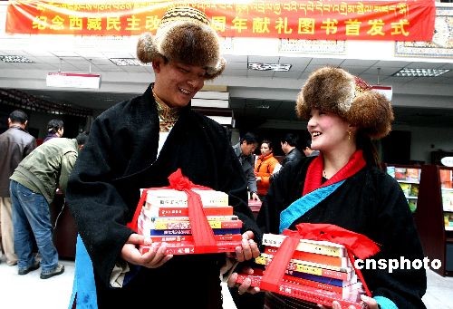 3月25日,纪念西藏民主改革50周年献礼图书首发式在拉萨举行。藏汉文版大型画册《西藏今昔》、全彩版图书《雪域边线行》、藏文版《西藏民主改革50年》等图书在具有历史重大意义的时候为读者献上一份厚礼。中新社发 杜洋 摄