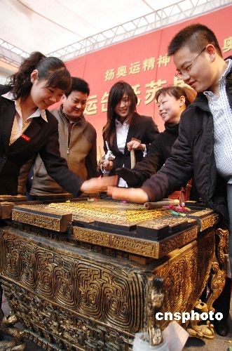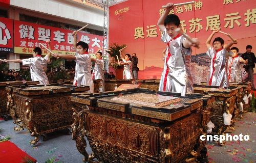 3月27日,8只精美的“奥运缶”在江苏苏州展出。苏州市民除了可以零距离亲眼目睹“奥运缶”外还可以免费击缶。中新社发 苏民 摄