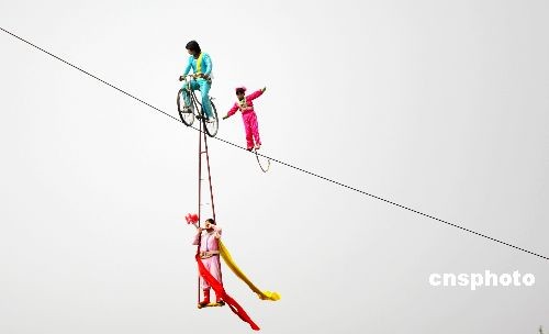 4月1日,上海植物园一个六岁小姑娘徒手走钢丝,一边走一边还表演舞蹈动作,频频向观众飞吻,激起全场一阵阵惊叹声和掌声。据介绍,这个小姑娘从两岁半开始接受训练,是独一无二的走钢丝“神童”,至今仍保持着高空走钢丝的世界吉尼斯纪录。中新社发 王璋闻 摄