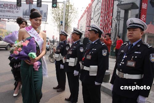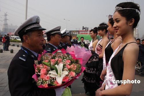 4月5日,国际旅游小姐河南赛区新评出的冠军、亚军、 季军以及第四名向郑州的老交警献花,表示慰问。她们从网络上了解到,这三位三位老交警平均年龄已经54岁,仍然不怕辛苦,坚持在交通管理第一线,深受感动。中新社发 王中举 摄