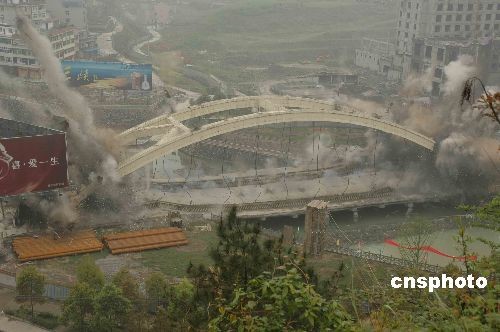 4月5日,在“5.12”汶川大地震中损坏的重庆市黔江区黔州大桥被成功爆破。黔州大桥于1997年建成,去年“5.12”汶川大地震后,大桥的拱肋、桥面及桥墩等多处出现裂痕,吊杆松动严重,当地政府采取限高等形式禁止客货载重车通行,并进行监测。2009年初,经专家勘测、检验,决定拆除该桥。中新社发 阮守军 摄
