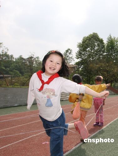 5月初,王彬与同学们开心地跳皮筋。梁平县在“5·12”大地震中是重庆市受灾严重的地区。在教学楼垮塌后,王彬为回去寻找还未能逃离的老师和同学,不幸被垮落的水泥板“切”掉右臂。目前,王彬已能用左手熟练地自理生活和学习,她说最大愿望是将来参加残奥会。中新社发 郭晋嘉 摄