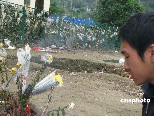 5月10日,在北川中学校园内,民众在悼念“5·12”汶川大地震中的遇难的师生们。图为一位北川中学的学生回来祭奠同学。中新社发 周潇男 摄