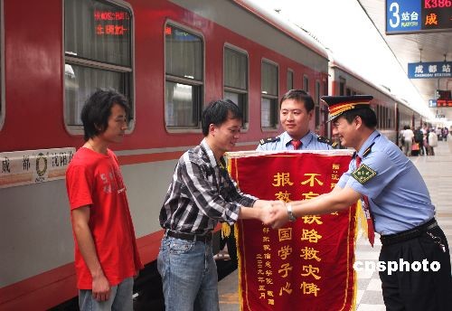 5月11日, “5.12”汶川大地震一周年,在地震中因校舍震损而前往大连异地复课的都江堰成都东软职业技术学院的师生,到成都站向沈阳客运段成都车队列车长送上写有“不忘铁路救灾情 报效祖国学子心”的锦旗,向铁路职工表达他们的感恩之心。2008年6月24日,沈阳铁路局担负运送四川学生前往大连异地复课的运输任务。一路上,沈阳客运段K386/7次列车为1500名师生热情服务、免费供餐,为师生组织了丰富多彩的旅途生活,并在列车上为薛锐、江巍等四名学生安排了生日晚会,师生们说;这不同寻常的生日晚会,我们一生不忘,这3000公里的旅途我们铭记在心。中新社发 高山水 摄