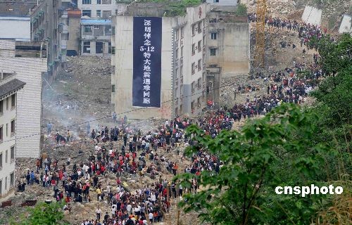 五月十二日是“四川特大地震”一周年纪念日,数万民众涌进曾遭摧毁的四川北川老县城,在家园废墟前祭奠遇难亲人。中新社发 贾国荣 摄