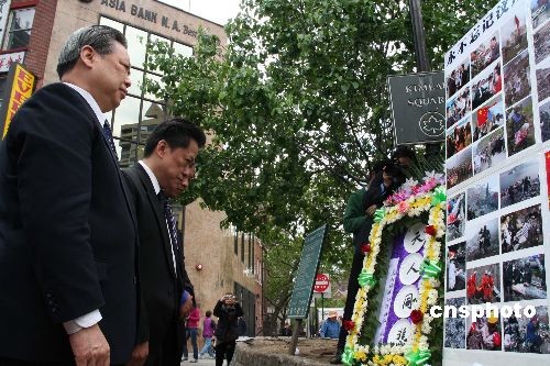 美国东部时间5月12日中午,美东华人社团联合总会在纽约举行隆重仪式,纪念汶川地震一周年。