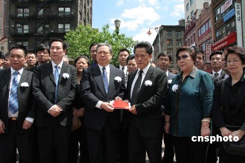 美东华人社团联合总会执行主席黄克锵(右三)当场把捐款转交给了中国驻纽约总领事彭克玉(右四),请总领馆将捐款转回国内。中新社发 魏晞 摄