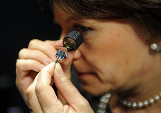 珠宝专家在鉴定这枚蓝色钻石。