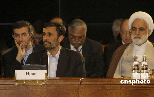 伊朗总统艾哈迈迪-内贾德(前左)六月十六日上午抵达俄罗斯叶卡捷琳堡,出席上海合作组织第九次峰会,较原定十五日抵达的计划推迟了一天。中新社发 齐彬 摄