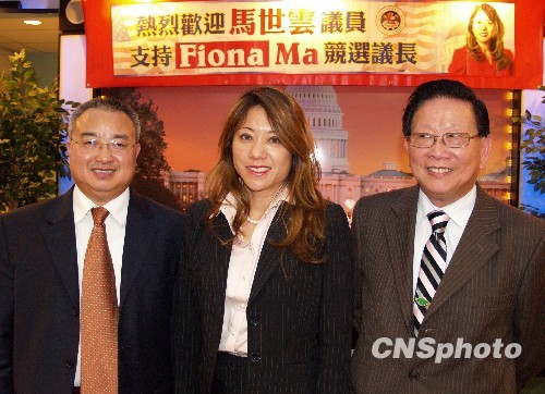 当地时间11月5日,美国哈伯特实验室主任王鼎华(左)在洛杉矶公开支持加州众议员马世云参选加州众议会议长。马世云如果顺利当选,她将成为加州历史上首位亚裔女议长。图左起为:王鼎华、马世云、特别助理谢汉屏。中新社发 卢威 摄