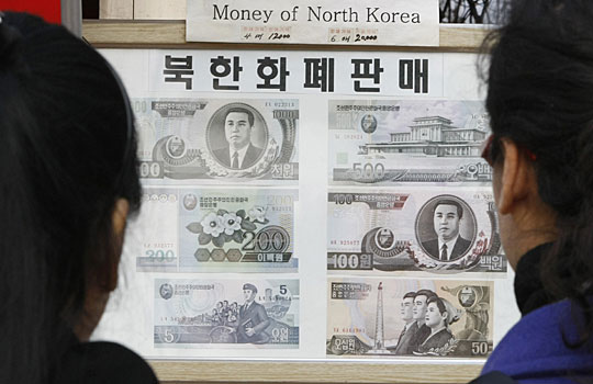 12月1日,韩国板门店一侧的韩国游客正在一块展板前看新出的朝鲜货币。据朝鲜官员当日对外透露,朝鲜于11月30日更换了货币,这是该国十七年来首次更换货币。新旧货币兑换率为100比1。