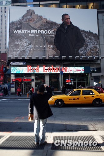 美国“Weatherproof”制衣公司近日表示,同意将奥巴马穿着该公司牌子风衣在长城留影的广告牌撤下。白宫表示,总统的名字或形象,不能拿来从事商业用途,这是白宫的一贯政策。十二日依然矗立在时代广场附近的这幅奥巴马广告牌时常引得路人驻足。中新社发 孙宇挺 摄