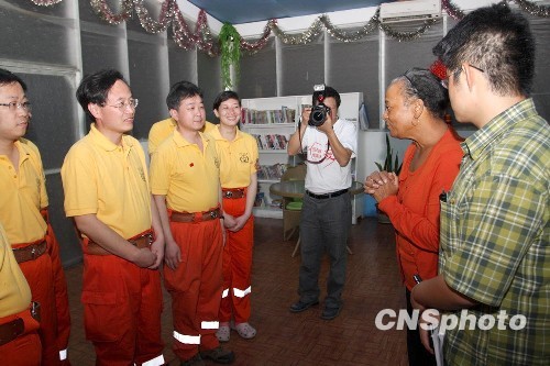 当地时间1月16日19:30,海地总理夫人贝勒里维(Bellerive)到中国国际救援队营地访问,专程看望武警总医院赴海地国际救援医疗队队员,对设在总理府内的医疗救助行动表示衷心感谢,她称赞道:“衷心感谢中国对海地的援助!你们在总理府设置医疗点,救助了大量伤病员,海地人民感谢你们!” 中新社发 武警总医院供稿 摄