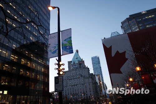 温哥华2010冬奥会开幕前夕,随处可见的冬奥会宣传旗帜与巨大的枫叶成为温哥华街头一景。温哥华2010冬奥会将于当地时间2月12日至28日在加拿大温哥华举行。中新社发 盛佳鹏 摄