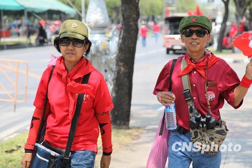 泰国红衫军领导人威腊14日中午在红衫军聚集中心发表声明说,阿披实政府必须在24小时内解散众议院,否则将面临更大规模的示威游行。图为一对来自泰国北部的夫妻红衫军走向集结点。中新社发 顾时宏 摄