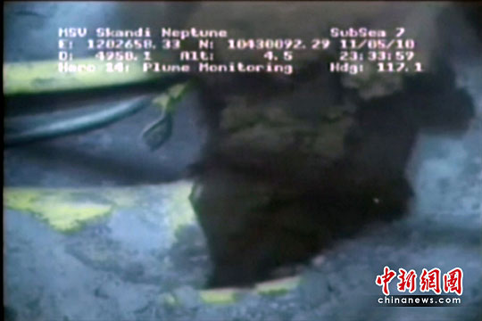 5月13日消息,英国石油公司公布了墨西哥湾油井泄露的首张水下图片。这张照片显示,位于海平面一英里以下的一个破裂的管道仍在不断冒出原油。