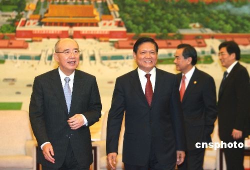 5月26日中午,中共北京市委书记刘淇在北京人民大会堂北京厅会见中国国民党主席吴伯雄一行。中台办主任王毅、北京市市长郭金龙等参加会见。中新社发 任晨鸣 摄