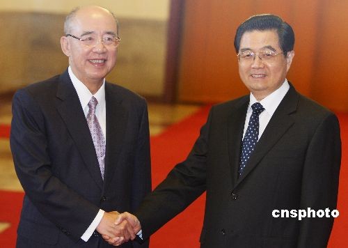 5月26日下午,中共中央总书记胡锦涛在北京人民大会堂会见中国国民党主席吴伯雄一行。 中新社发 任晨鸣 摄