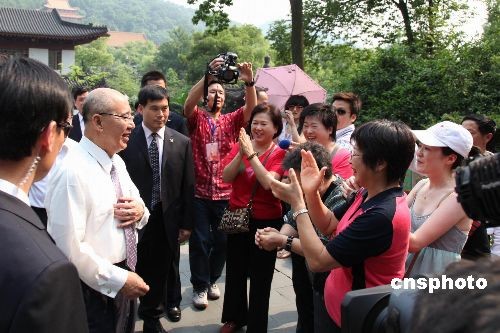 中国国民党主席吴伯雄一行五月二十九日抵达杭州,这两日除了尽享美景之外,令吴伯雄没有想到的是他俨然成了“西子湖畔的明星”。图为雷峰塔下许多游客像是吴伯雄的“粉丝”似的,人手一台相机或手机,抢着拍下难得的镜头。中新社发 王健 摄