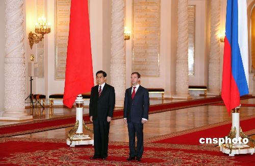 当地时间六月十七日,俄罗斯总统梅德韦杰夫在莫斯科克里姆林宫举行仪式,欢迎中国国家主席胡锦涛对俄罗斯进行国事访问。中新社发 齐彬 摄
