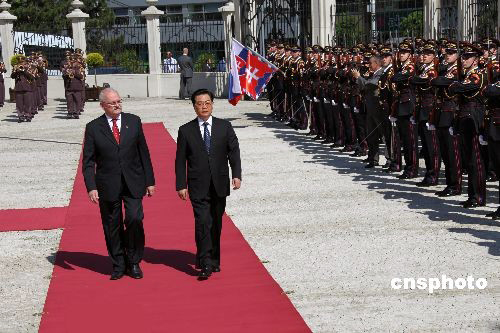 斯洛伐克总统加什帕罗维奇6月18日下午举行隆重仪式,热烈欢迎中国国家主席胡锦涛对斯洛伐克进行国事访问。中新社发 齐彬 摄