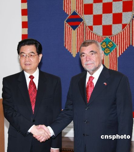 当地时间6月20日上午,正在克罗地亚进行国事访问的中国国家主席胡锦涛,在萨格勒布与克罗地亚总统梅西奇举行会谈。中新社发 齐彬 摄