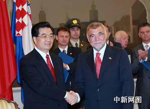 中国国家主席胡锦涛,二十日在克罗地亚总统府与梅西奇总统举行会谈,随后两国元首出席有关经贸、卫生、航空运输等领域合作文件的签字仪式,并共同会见记者。中新社发 齐彬摄
