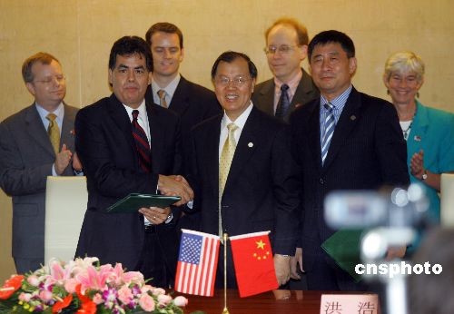 7月10日,美国政府与上海世博会事务协调局在沪签署了中国2010年上海世博会参展合同,并公布了“欢庆2030年”的参展主题。 图为费乐友先生(左)和中国政府总代表华君铎(中)在签署合同后握手留念。 中新社发 高尔强 摄