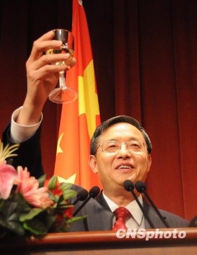 当地时间九月十九日晚,中国驻美大使周文重夫妇在使馆举行国庆六十周年华侨华人与留学生专场招待会。图为周文重在当晚的招待会上与到会的华人华侨和留学生一起为新中国六十年华诞干杯。中新社发 吴庆才 摄