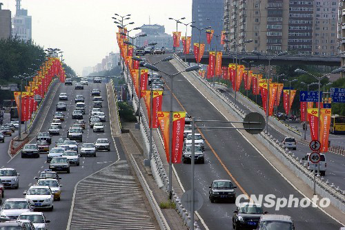 国庆临近,北京长安街上挂起竖幅彩旗,营造出浓厚的节日喜庆气氛。彩旗上印着“热烈庆祝中华人民共和国成立六十周年”,在秋风的吹拂下袭袭飘扬。中新社发 九州 摄