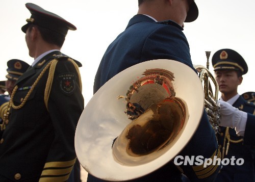10月1日,中华人民共和国成立60周年盛大庆典将在北京天安门广场举行。盛典开始前,年轻的军乐队号手认真做着准备。中新社发 杜洋 摄