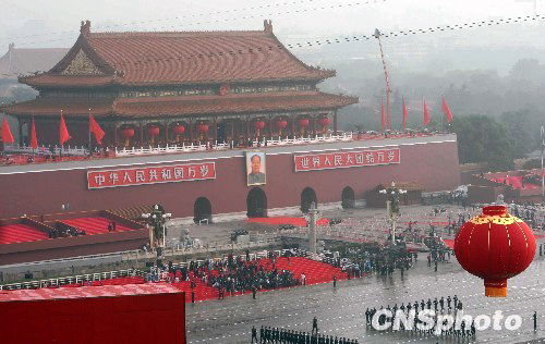 10月1日,中华人民共和国成立60周年庆祝大会将在北京天安门广场举行。图为盛典开始前的北京天安门。中新社发 赵振清 摄