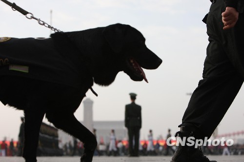 10月1日,中华人民共和国成立60周年庆祝大会开始前,警务人员携搜爆犬在天安门广场做最后的安全检查。中新社发 杜洋 摄