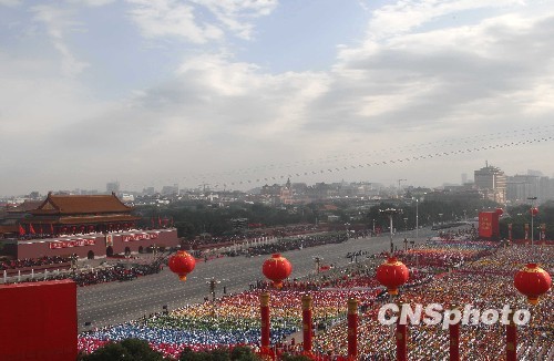 2009年10月1日,中华人民共和国成立60周年庆祝大会将在北京天安门广场举行。图为盛典开始前的北京天安门广场节日气氛浓郁。中新社发 赵振清 摄