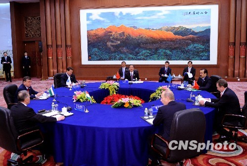 10月14日,上海合作组织成员国总理小范围会谈在北京人民大会堂举行。中国政府总理温家宝主持会议。中新社发 廖攀 摄