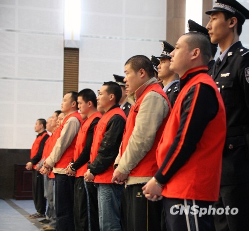 10月21日上午,第一个开庭审理的重庆 “涉黑涉恶”案件在该市第一中级人民法院陆续开庭审理。法院一审认定杨天庆及其成员组织、领导和参与黑社会性质组织罪、故意伤害、伪造居民身份证等罪行成立。其中,杨天庆和另一被告人刘成虎被判处死刑,并处以50万元人民币的罚金。图为宣判现场。中新社发 重庆一中院 摄