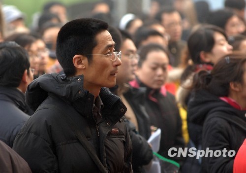 11月29日,2010年度中央机关及其直属机构公务员录用考试公共科目笔试开考。预计将有100万人参加考试,创下了历年报考人数的新高。在全国招录的1.5万个职位中,多个职位报录比超过1000:1,竞争激烈。许多考生屡败屡战,成为国考“专业户”。图为当日一早,考生在北京68中学考点候考。中新社发 李学仕 摄