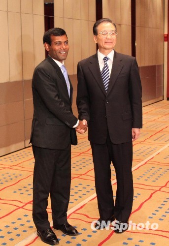 当地时间十二月十七日中午,在丹麦参加哥本哈根气候变化会议的中国国务院总理温家宝会见了马尔代夫总统纳希德。中新社发 余湛奕 摄