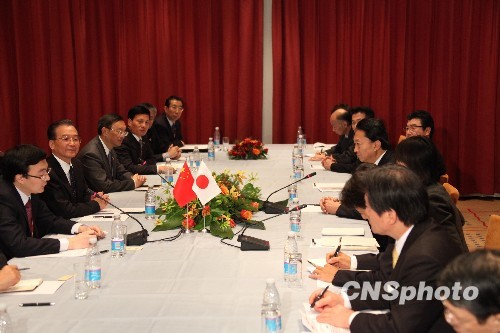 当地时间十七日下午,在丹麦出席哥本哈根气候变化会议的中国国务院总理温家宝会见了日本首相鸠山由纪夫。温家宝在会见时表示,日本曾经为推动应对气候变化的国际合作做出过重要贡献。中新社发 余湛奕 摄