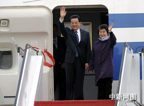 12月19日中午,中共中央总书记、国家主席、中央军委主席胡锦涛乘专机抵达澳门出席庆祝澳门回归祖国10周年活动。胡锦涛主席和夫人走出机舱时向欢迎的人群挥手致意。中新社记者 廖攀 摄