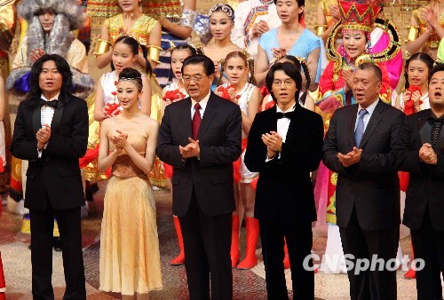 十二月十九日晚,澳门特区举行盛大文艺晚会,庆祝澳门回归祖国十周年。国家主席胡锦涛与演员一起唱响《歌唱祖国》。中新社发 洪少葵 摄