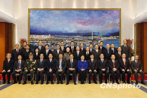 十二月十九日,国家主席胡锦涛在澳门东亚运动会体育馆会见澳门特别行政区现任行政、立法、司法机关负责人,并合影留念。中新社发 GCS 摄