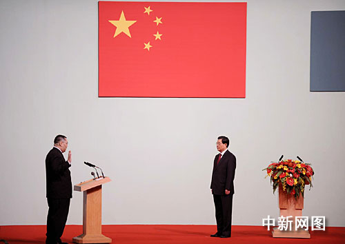 12月20日,庆祝澳门回归祖国十周年大会暨澳门特别行政区第三届政府就职典礼在澳门东亚运动会体育馆举行。澳门特区第三任行政长官崔世安宣誓就职,国家主席胡锦涛监誓。中新社记者 廖攀 摄