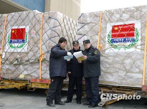1月16日,北京海关快速验放中国政府向海地提供的首批紧急人道主义救灾物资。该批紧急救灾物资包括两套净水设备、1000顶帐篷,以及各类药品、食品、衣服和应急设备在内共4175箱,近90吨。中新社发 雷虹 摄