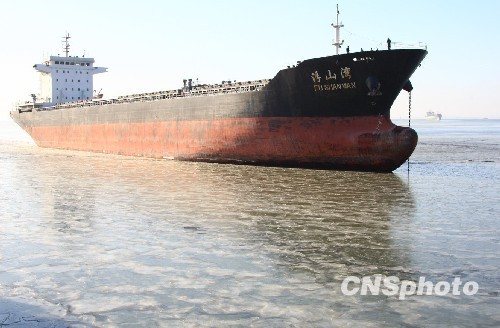 受连续低温寒潮天气影响,渤海海域近期遭遇了近30年来最严重的海冰冰情。部分水域冰层厚度超过30厘米,部分港口完全封港,中国最大的煤炭输出港--秦皇岛港电煤等待外运,对海上交通运输和港口安全生产造成了严重影响。图为由于港口结冰大型船舶无法停靠,只好在港口外抛锚。中新社发 张雷 摄