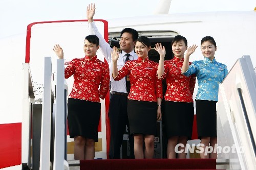 3月2日,参加全国两会的代表、委员陆续乘机抵达北京,班机上的空乘人员向即将驶往驻地的代表、委员挥手送别。中新社发 杜洋 摄